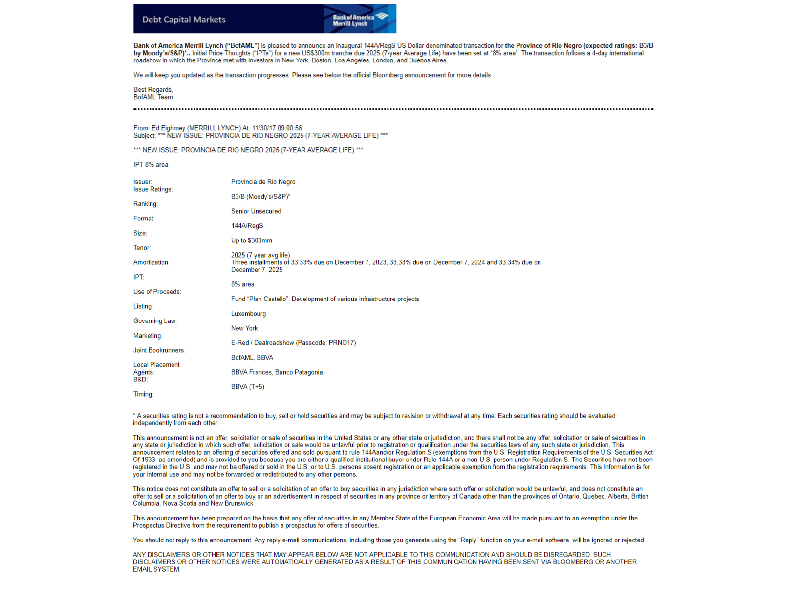 El proceso de colocación del bono ha sido exitoso para la Provincia, habida cuenta que se trata de la primera vez que Río Negro accede al mercado financiero internacional.