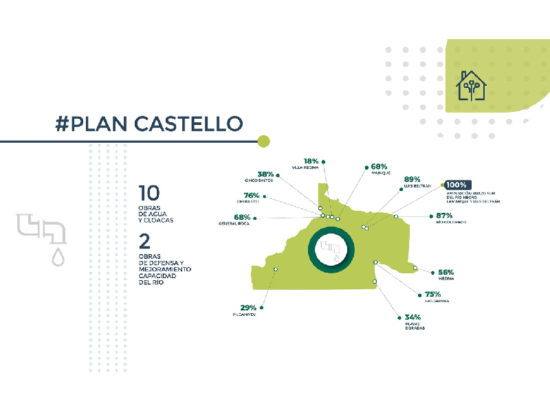Los Planes Directores de Cloacas, que se planificaron bajo la modalidad de “vuelco cero”, se encuentran con el siguiente porcentaje de avance: Las Grutas (75%), Río Colorado (87%), Luis Beltrán (89%) -los tres terminarán en 2020-, Cinco Saltos (38%), Pilcaniyeu (29%), Mainqué (68%), Viedma (56%), Playas Doradas (34%) y Villa Regina (18%).
