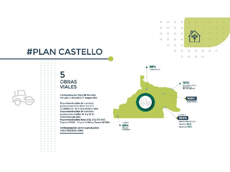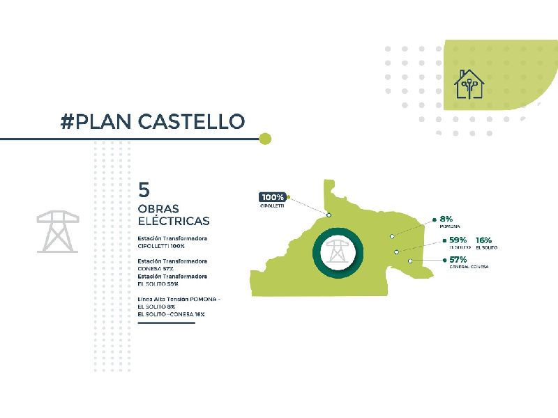 La repavimentación de caminos productivos se encuentra en un 92% de avance en Río Colorado y 58%, en Chichinales. Ambas finalizarán en 2020. La estación transformadora de El Solito tiene 59% y la de General Conesa, un 57%; y la línea de alta tensión Pomona-El Solito está en un 8% de avance y El Solito–General Conesa, al 16%. Todas estarán listas el año que viene, en 2021.