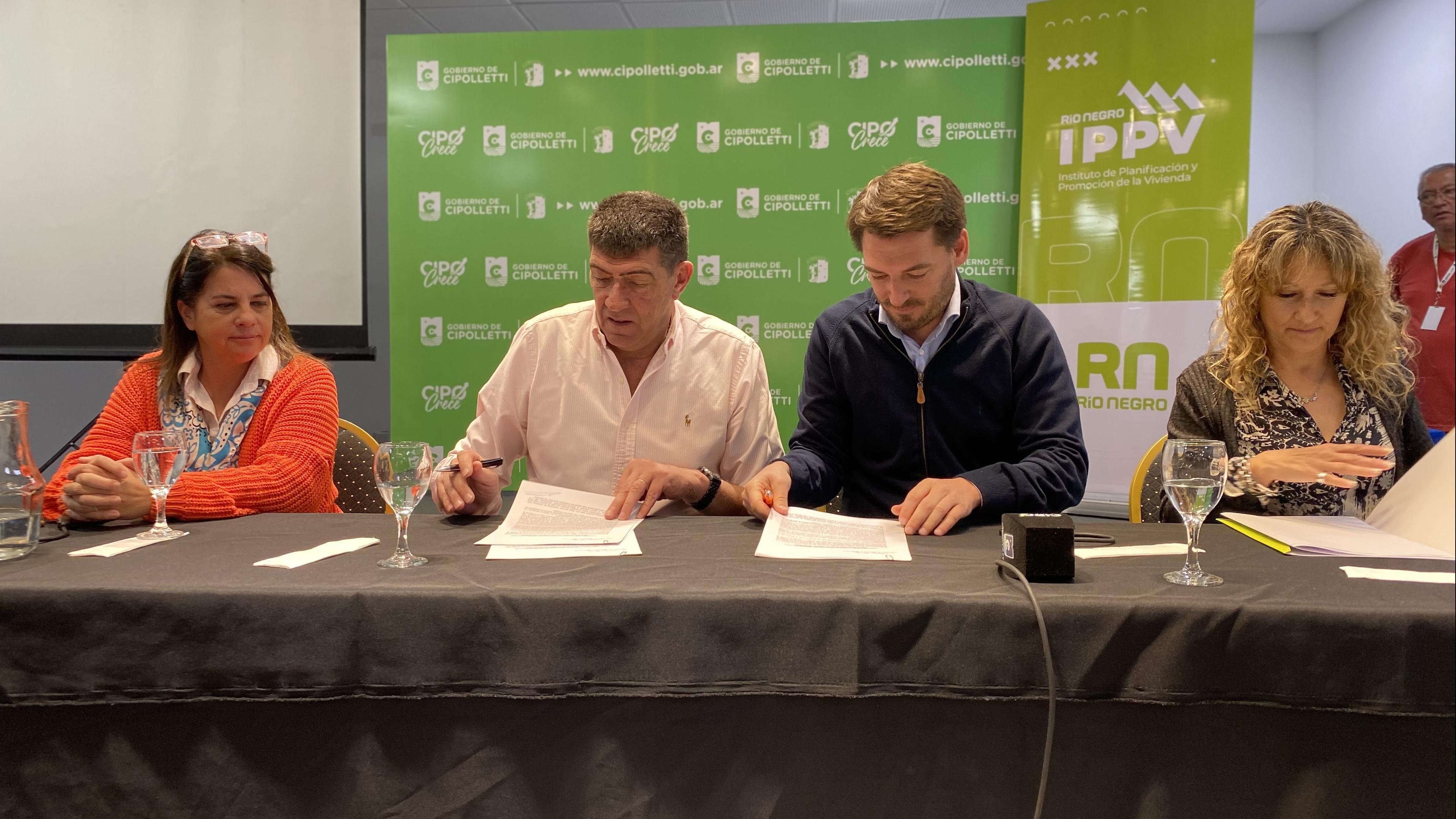 El ministro de Gobierno y Comunidad, Rodrigo Buteler, y el intendente de Cipolletti, Claudio Di Tella, firmaron el convenio específico para implementar el programa provincial “Mi escritura, un derecho” en el barrio Anai Mapu.